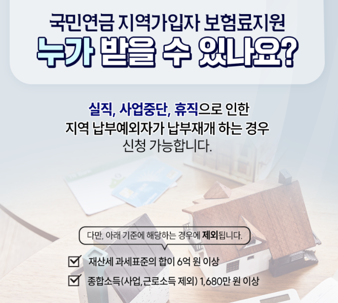 | 지원 대상 | 실직, 사업중단, 휴직으로 인한 지역 납부예외자가 납부재개하는 경우 (단, 재산세와 종합소득 기준 초과 시 제외) |
