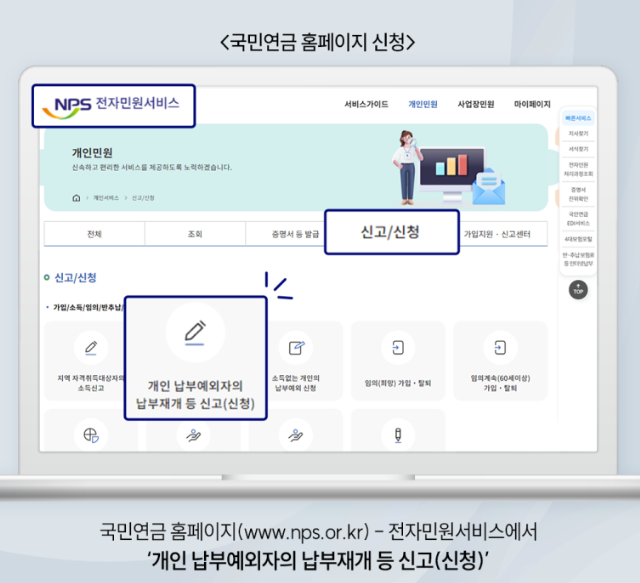 - [전자민원서비스] - [개인민원]의 [신고/신청] – [개인 납부예외자의 납부재개 등 신고(신청)]에서 진행