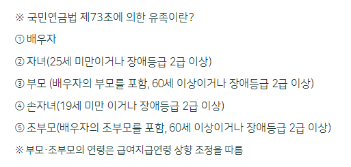아울러 사망한 자에 대하여 유족연금이나 반환일시금을 지급받을 수 있는 국민연금법 제73조 상의 유족이 존재하지 않아야 합니다. 배우자, 자녀, 부모, 손자녀, 조부모, 형제자매 등이 여기에 포함되며, 사망자에 의해 생계를 유지하던 4촌 이내의 방계혈족도 해당됩니다.