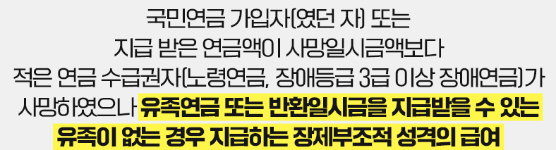 | 사망일시금 개요 | - 가입자(였던 자) 또는 연금액이 사망일시금액에 미달하는 연금 수급권자 사망 시, 유족연금반환일시금 수급 유족이 부재한 경우 지급 - 장제부조적 성격의 급여로 국민연금 사각지대 보완 및 수혜범위 확장 |