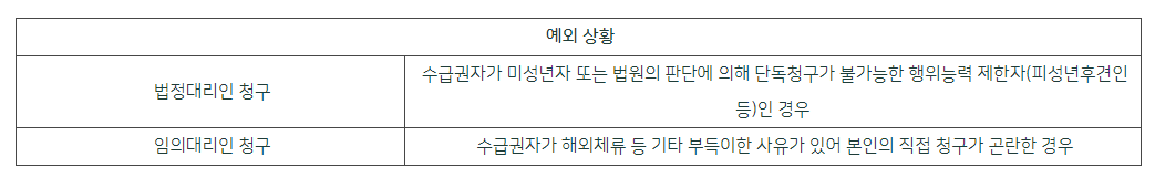 사망일시금은 원칙적으로 수급권자 본인의 청구를 통해 이뤄져야 하지만, 미성년자나 피성년후견인 등 단독 청구가 어려운 경우에는 법정대리인에 의한 청구도 가능합니다. 또한 해외 체류 등으로 말미암아 본인 청구가 여의치 않은 경우라면 임의대리인 청구의 방법도 열려 있습니다.