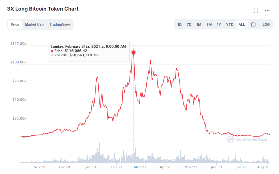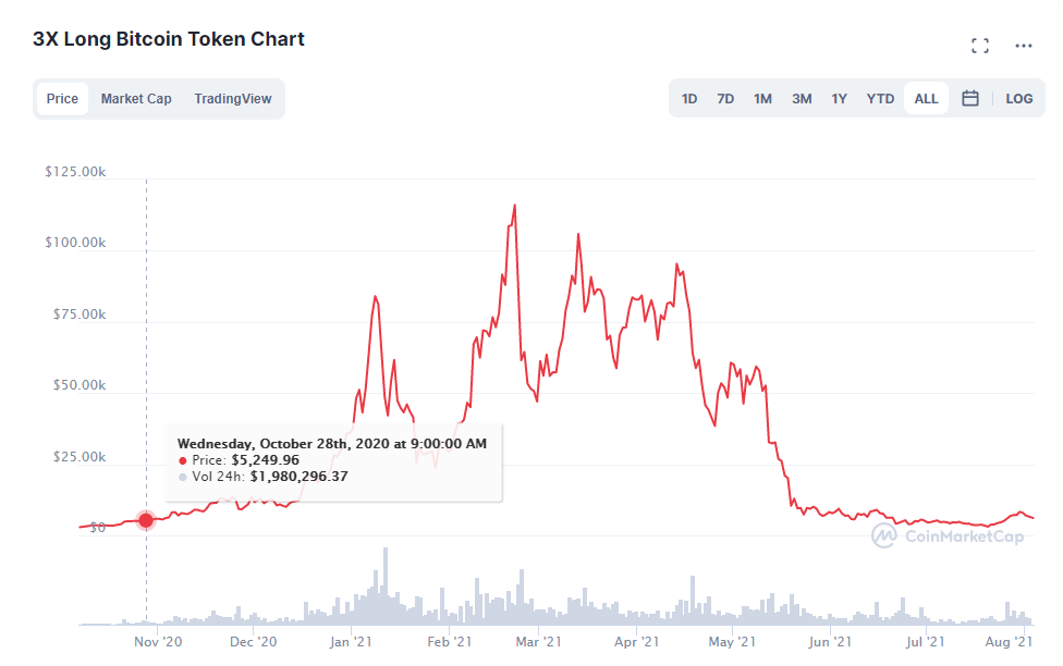 세번째 엄청난 변동성. 위에 차트 보시면 2020년 11월 경에 비트코인 레버리지 코인이 5,000달러 정도였는데
