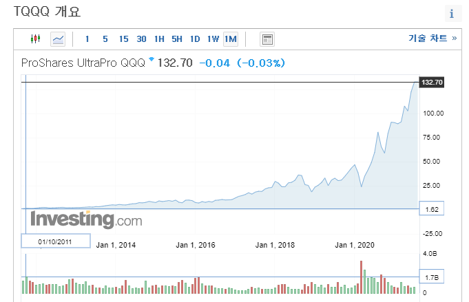 TQQQ가 2011년에 나왔을때 1.6달러였습니다. 지금은 132.7달러 이구요. 불과 10년만에 자산이 83배가 오른겁니다. 당연히 그 사이에 엄청난 하락장도 있었고, 폭락 시기, 코로나 등등 별의별 힘든 시기가 있었지만 결국 우상향을 믿는다면?